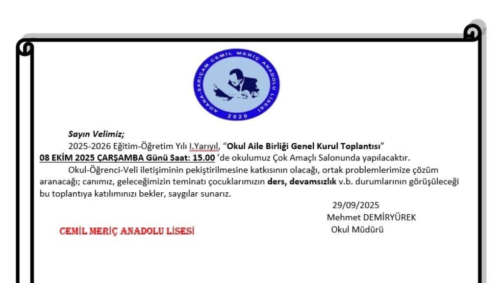2025-2026 EĞİTİM ÖĞRETİM YILI OKUL AİLE BİRLİĞİ TOPLANTISI 08.10.2025 TARİHİNDE OKULUMUZDA YAPILACAKTIR TÜM VELİLERİMİZİN KATILMASINI TEMENNİ EDERİZ